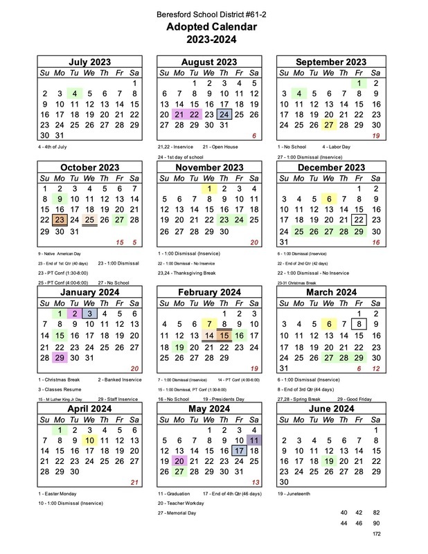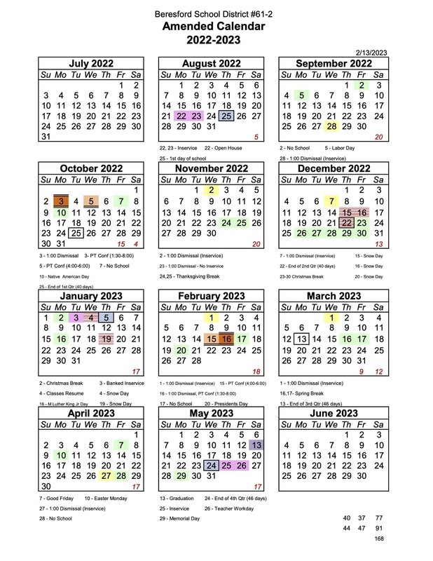 The Beresford School District Board of Education amended our school calendar for the 2022-2023 school year. Our last day of school will be Wednesday, May 24, 2023. We will have teacher inservice on Thursday, May 25, 2023, and a teacher workday on Friday, May 26, 2023.