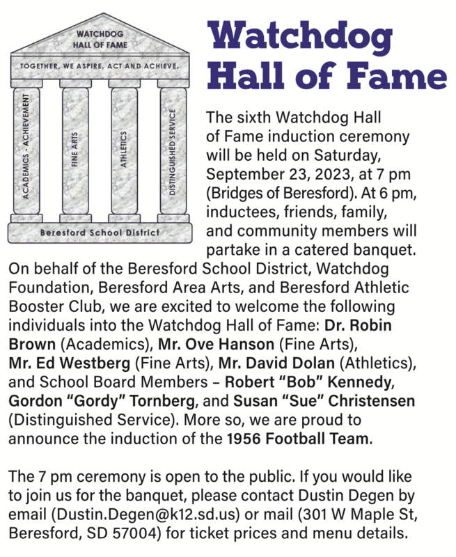 The sixth Watchdog Hall of Fame induction ceremony will be held on Saturday, September 23, 2022, at 7:00 p.m. (Bridges of Beresford). At 6:00 p.m., inductees, friends, family, and community members will partake in a catered banquet. On behalf of the Beresford School District, Watchdog Foundation, Beresford Area Arts, and Beresford Athletic Booster Club, we are excited to welcome the following individuals into the Watchdog Hall of Fame: Dr. Robin Brown (Academics), Mr. Ove Hanson (Fine Arts), Mr. Ed Westberg (Fine Arts), Mr. David Dolan (Athletics), and School Board Members -Robert “Bob” Kennedy, Gordon “Gordy” Tornberg, and Susan “Sue” Christensen (Distinguished Service). More so, we are proud to announce the induction of the 1956 Football Team. The 7:00 p.m. ceremony is open to the public. If you would like to join us for the banquet, please contact Dustin Degen by email (Dustin.Degen@k12.sd.us) or mail (301 West Maple Street, Beresford, SD 57004) for ticket prices and menu details.
