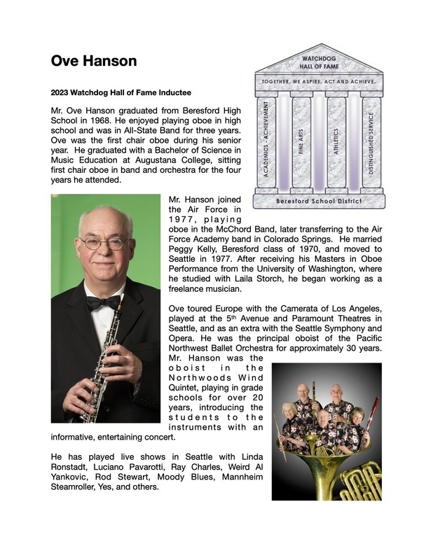 The Beresford School District, Watchdog Foundation, Beresford Area Arts, and Beresford Athletic Booster Club are proud to announce Ove Hanson for induction into our Watchdog Hall of Fame. Ove Hanson is a 1968 Beresford High School graduate. Mr. Hanson will be inducted under the Fine Arts pillar.