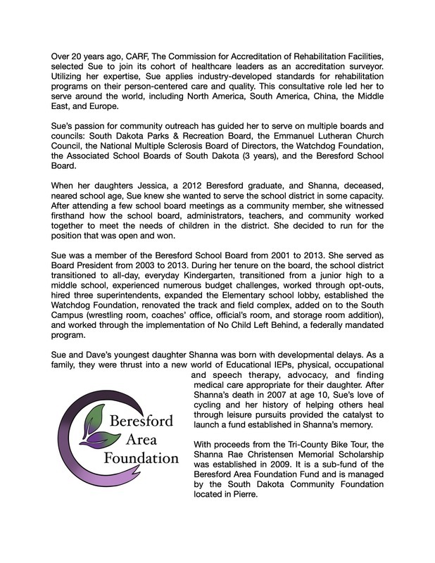 The Beresford School District, Watchdog Foundation, Beresford Area Arts, and Beresford Athletic Booster Club are proud to announce Mrs. Susan (Sue) Christensen for induction into our Watchdog Hall of Fame. Mrs. Christensen will be inducted under the Distinguished Service pillar.