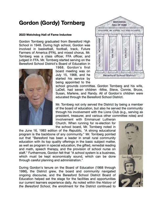 The Beresford School District, Watchdog Foundation, Beresford Area Arts, and Beresford Athletic Booster Club are proud to announce Mr. Gordon (Gordy) Tornberg for induction into our Watchdog Hall of Fame. Mr. Tornberg is a 1948 Beresford High School graduate. Mr. Tornberg will be inducted under the Distinguished Service pillar.