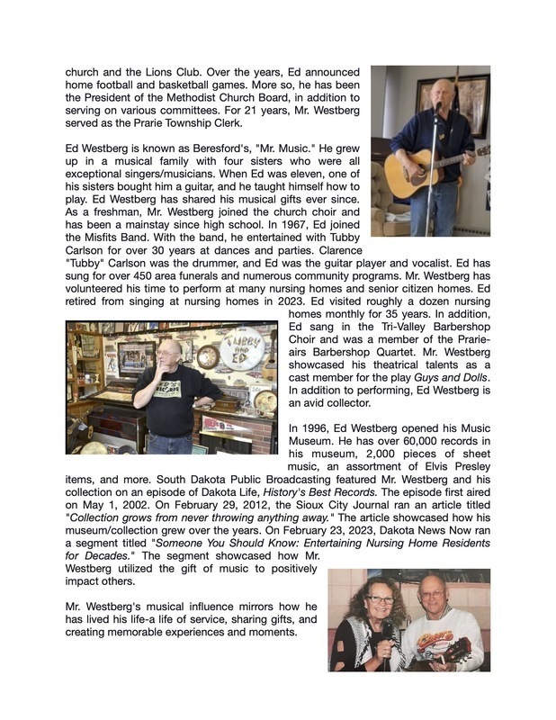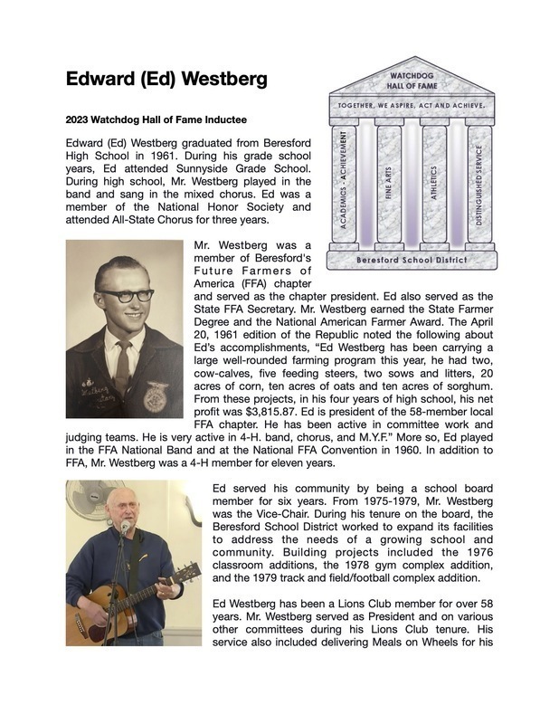 The Beresford School District, Watchdog Foundation, Beresford Area Arts, and Beresford Athletic Booster Club are proud to announce Edward (Ed) Westberg for induction into our Watchdog Hall of Fame. Ed Westberg is a 1961 Beresford High School graduate. Mr. Westberg will be inducted under the Fine Arts pillar.