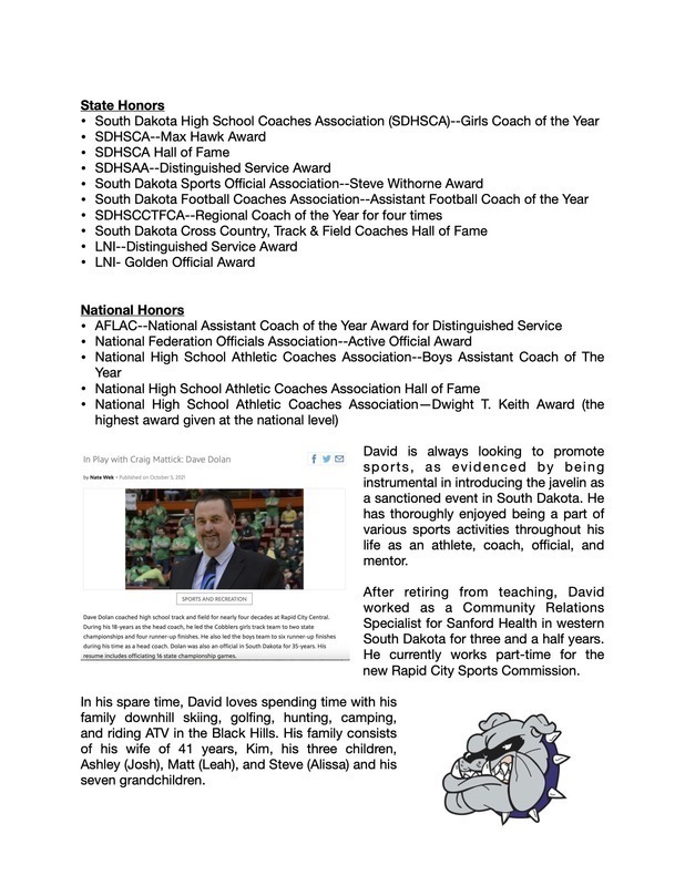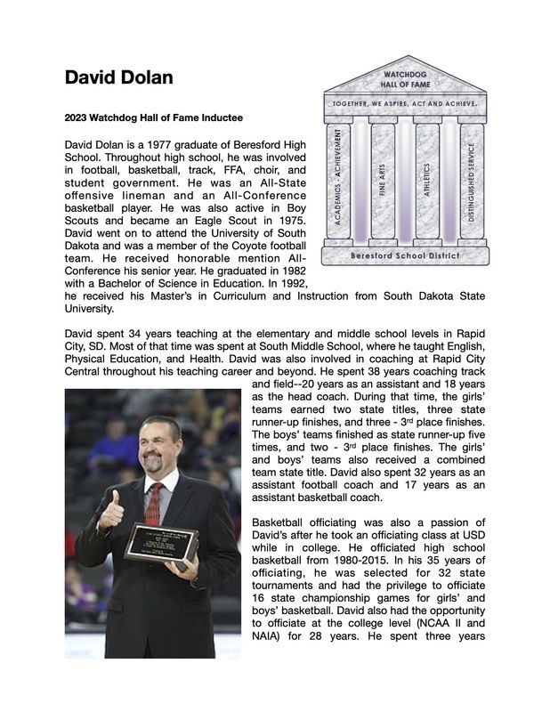 The Beresford School District, Watchdog Foundation, Beresford Area Arts, and Beresford Athletic Booster Club are proud to announce Mr. David Dolan for induction into our Watchdog Hall of Fame. Mr. Dolan is a 1977 Beresford High School graduate. Mr. Dolan will be inducted under the Athletics pillar.