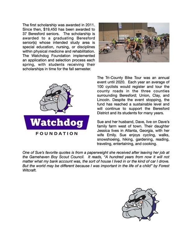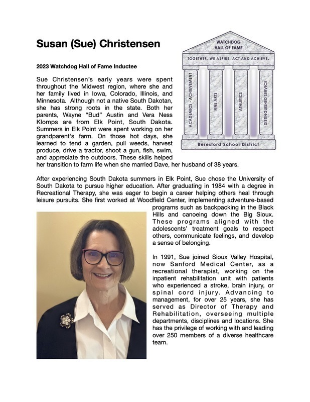 The Beresford School District, Watchdog Foundation, Beresford Area Arts, and Beresford Athletic Booster Club are proud to announce Mrs. Susan (Sue) Christensen for induction into our Watchdog Hall of Fame. Mrs. Christensen will be inducted under the Distinguished Service pillar.