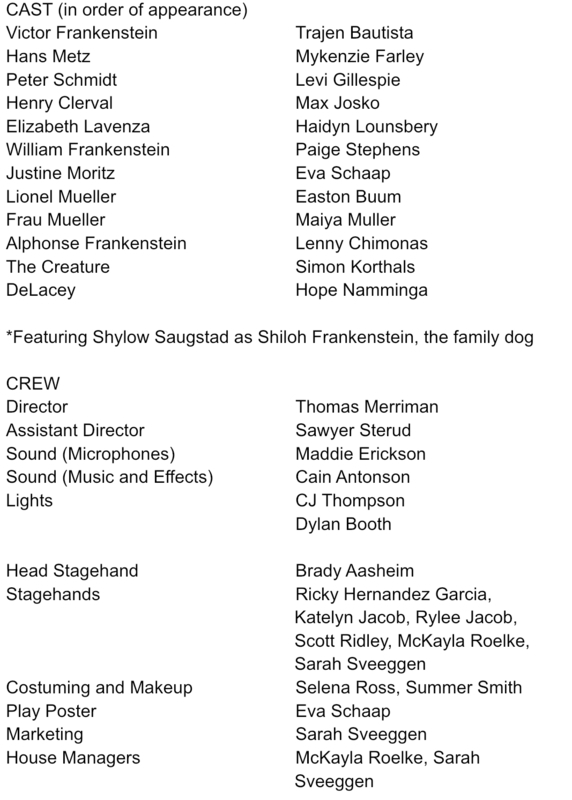 Congratulations to our Beresford High School cast and crew, who put on an enjoyable and memorable performance of Frankenstein by Victor Gianlanella (e.g., adapted from the novel by Mary Shelley)! Throughout the performances, audience members watched Frankenstein's internal struggle to find meaning in his existence, his place in the world, how to cope with loss, and Frankenstein's desire for companionship. Throughout the play, we see how Frankenstein becomes a monster because of the actions and events caused by others.