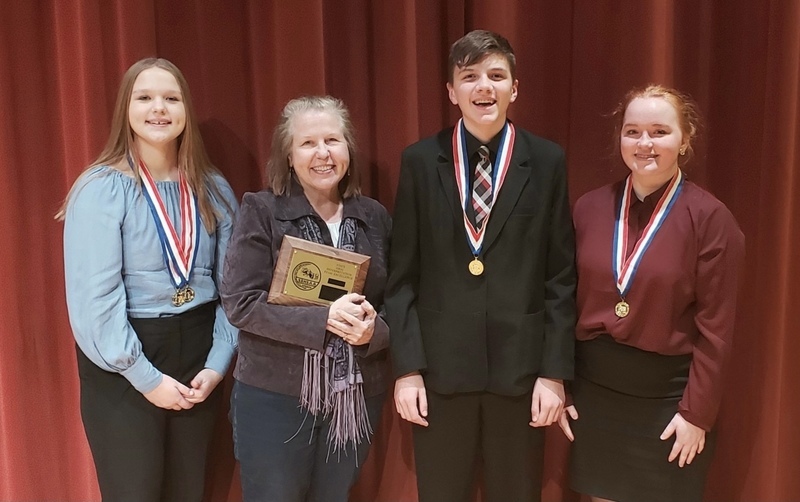 Max Josko and Laney Andrews received a Superior Rating in Duet Acting. Emma Andrews received a Superior in Poetry and a Superior with Distinction in Storytelling. The Superior with Distinction award means that she received a perfect score from all three of the judges. Emma Andrews was the only performer out of 15 Class A storytelling entries to receive this special award. The team is coached by Mrs. Ann Tornberg.