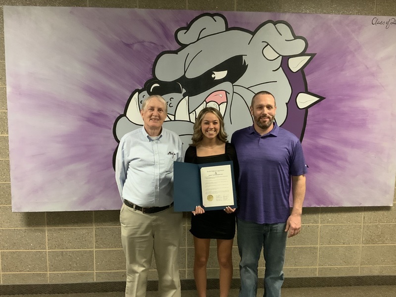 During the April school board meeting, Senator Jim Bolin joined the meeting at 6:15 p.m. to present Maiya Muller with a Legislative Proclamation for her State Golf Championship (2021). Pictured below (l to r): Senator Bolin, Maiya Muller, and Brad Muller