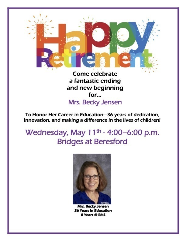 Please save the date for Mrs. Becky Jensen’s retirement party. The event will take place on Wednesday, May 11, 2022, from 4:00 p.m. to 6:00 p.m. at the Bridges of Beresford. We will celebrate Mrs. Jensen’s 36-years in education with snacks, cake, and fond memories. Eight of those years have been with the Beresford School District. Congratulations on your retirement Mrs. Jensen!