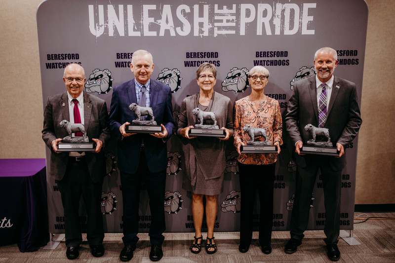 The Watchdog Hall of Fame inducted five individuals and one team on Saturday, September 17, 2022. Dr. Marvin Wastell, Mr. Paul Runyan, Dr. Shelly Kennedy, Mrs. Karla (Rick) Deuter, the 1977 Girls' Basketball Team, and Mr. Brian Field received their Hall of Fame Watchdog and addressed the crowd during the ceremony. The Hall of Fame exists because of the partnerships between the Beresford School District, the Watchdog Foundation, the Beresford Athletic Booster Club, and the Beresford Area Arts.
