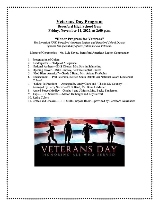 Join us for our annual "Honor Program for Veterans" on November 11, 2022, @ 2:00 p.m. (BHS Gymnasium). BHS NHS will host its annual Veteran Soup and Pie Social starting at 12:30 p.m. on 11-11-2022.